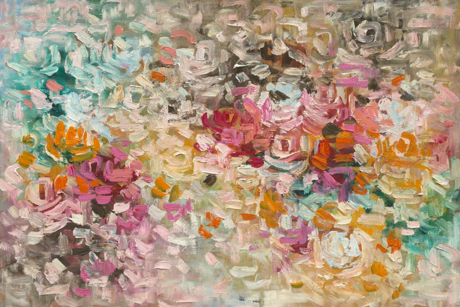 Working with oil paint, charcoal, spray paint and oil crayons, she captures a spectrum of moods – from quiet, melancholy moments of indigo and teal to swathes of Persian pink and saffron. The viewer can choose where they sit in this vast spectrum of emotion; whether they gravitate towards the darkness or the light.... READ MORE