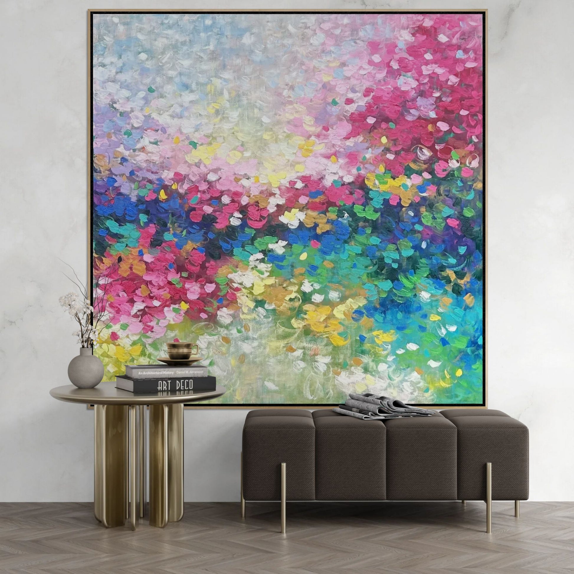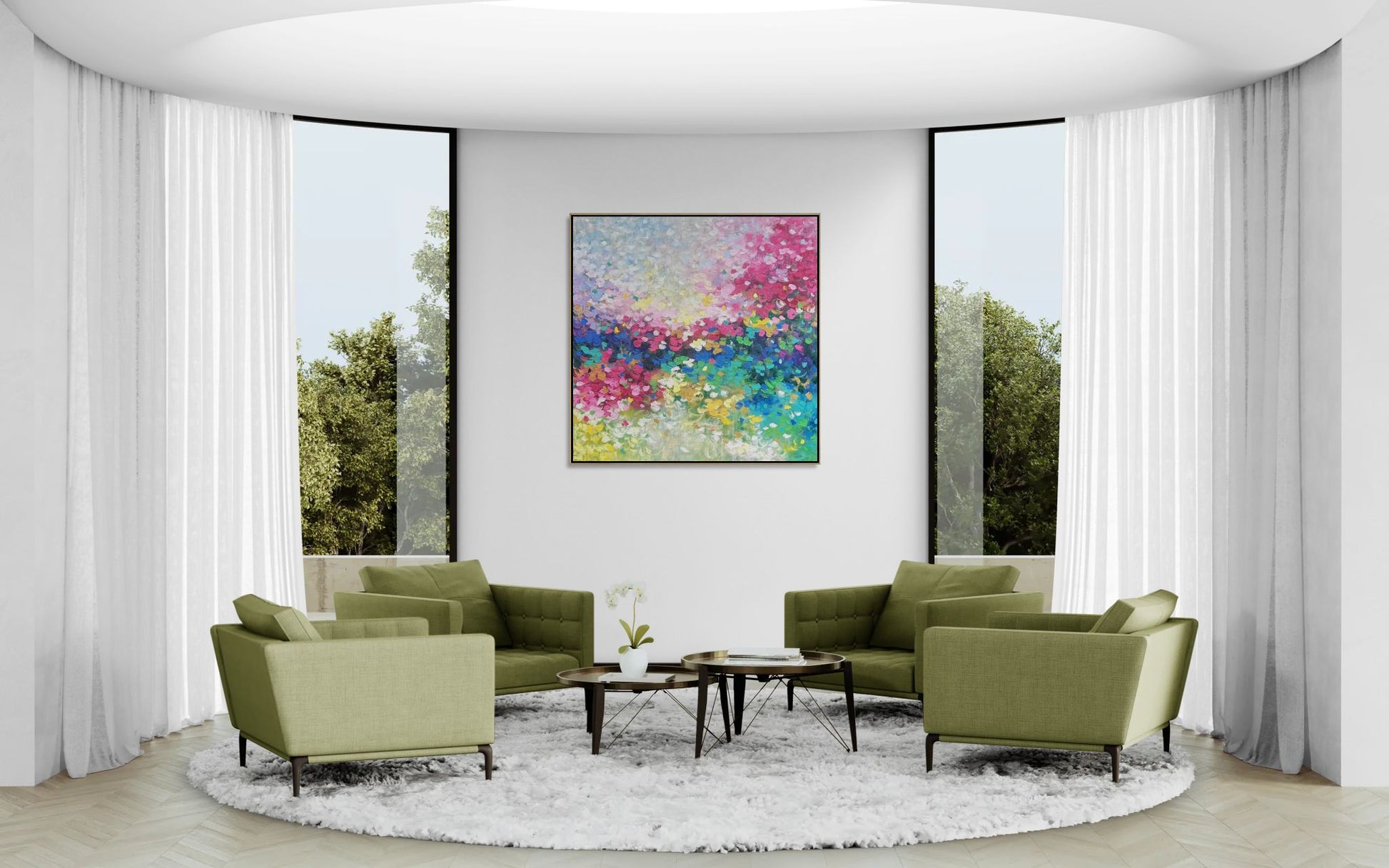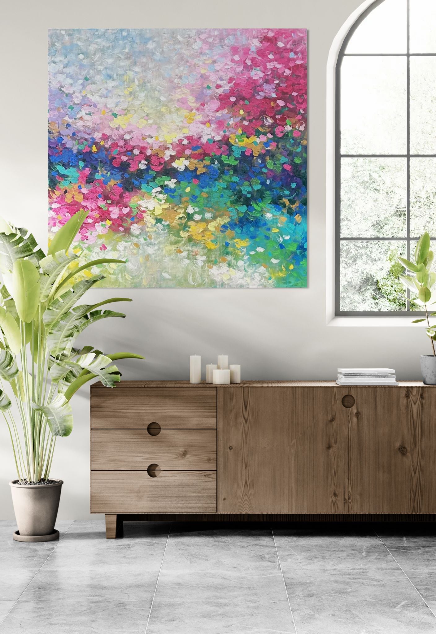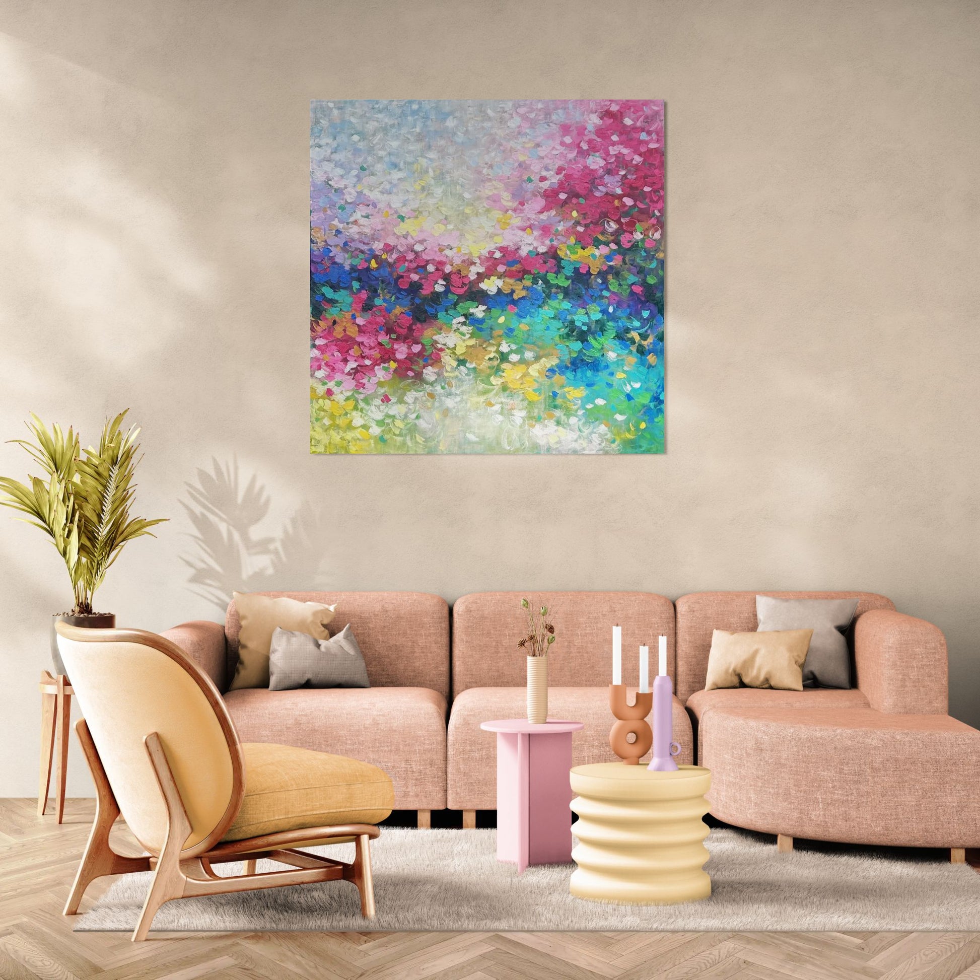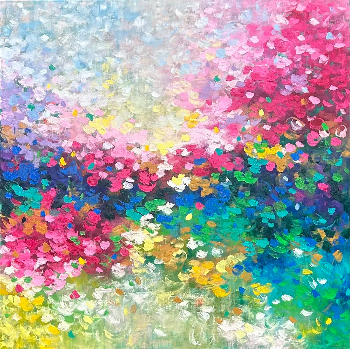 Belinda Nadwie's "Blue Skies Shining On Us" is a vibrant abstract oil painting that evokes the serenity of a sunlit day by the sea. Bursting with expressive colour, it blends joyful swathes of Persian pink, saffron, and oceanic blues to create a mood of peace and emotional uplift. The work is part of a series celebrating nature’s beauty and the emotional freedom of not sweating the small stuff.