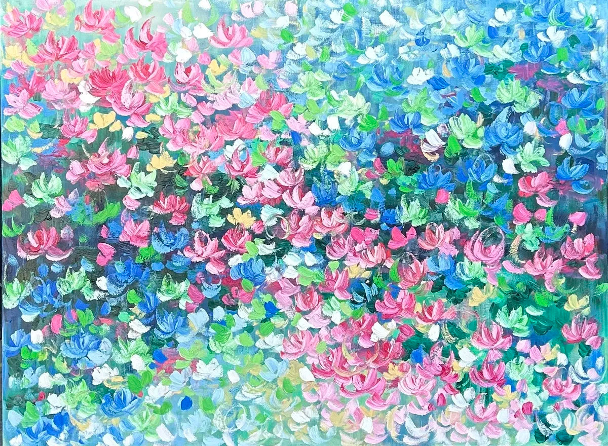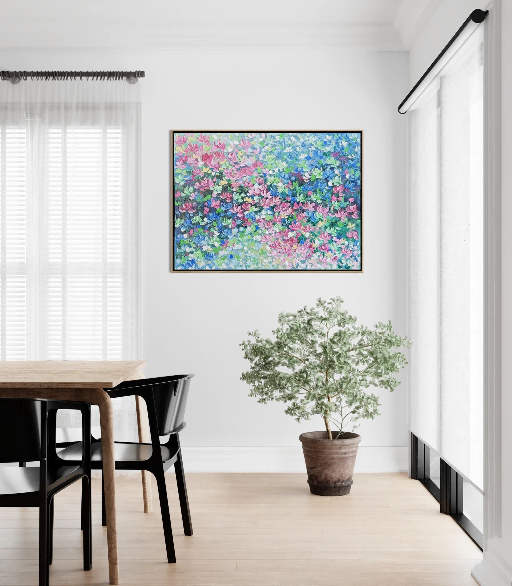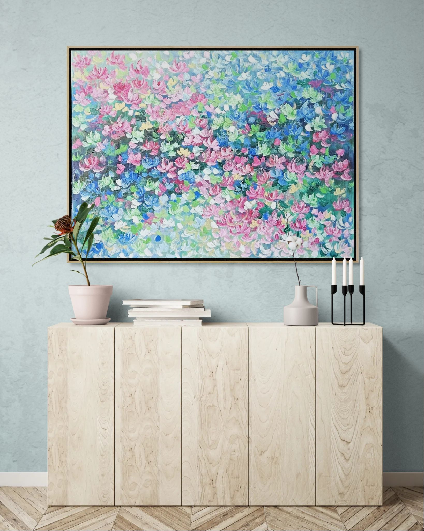 Belinda Nadwie's "Dancing Through Life" is a uniquely expressive abstract painting that captures the rhythm and spontaneity of joyful living. With sweeping strokes of blues and greens accented by playful flashes of pink, the piece evokes movement, freedom, and emotional vibrancy. Its textured layers and intuitive composition make it a standout celebration of colour and energy.