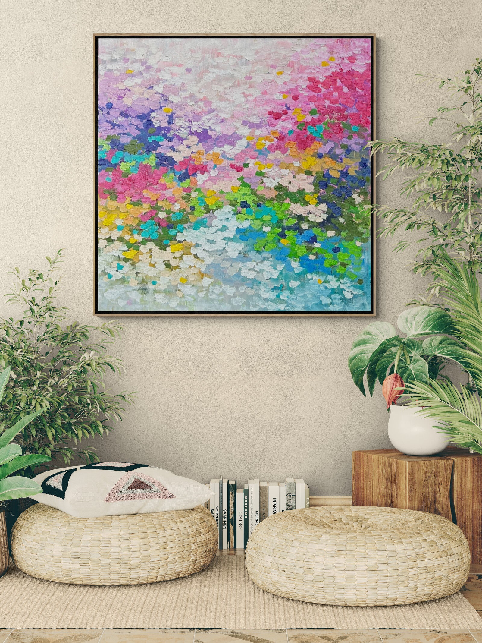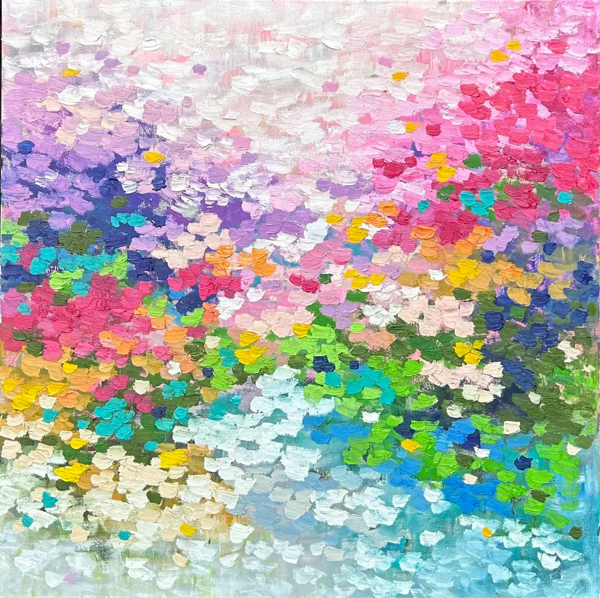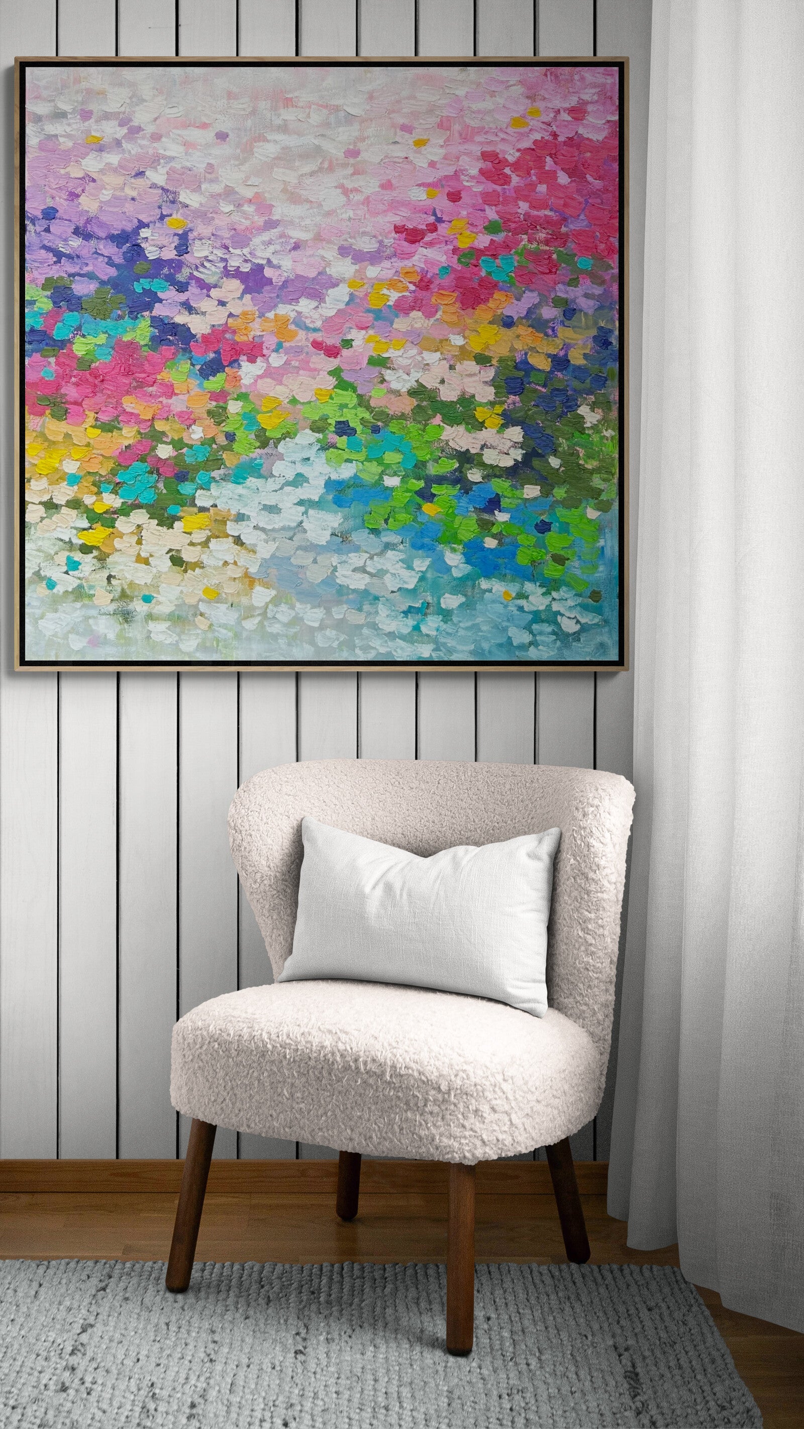 Embracing is a vibrant abstract oil painting by Belinda Nadwie that celebrates unity, love, and acceptance. Soft pinks, purples, greens, and blues blend together in textured, expressive strokes, symbolising harmony and emotional connection. The artwork radiates warmth and optimism, inviting calm and joy into any space.