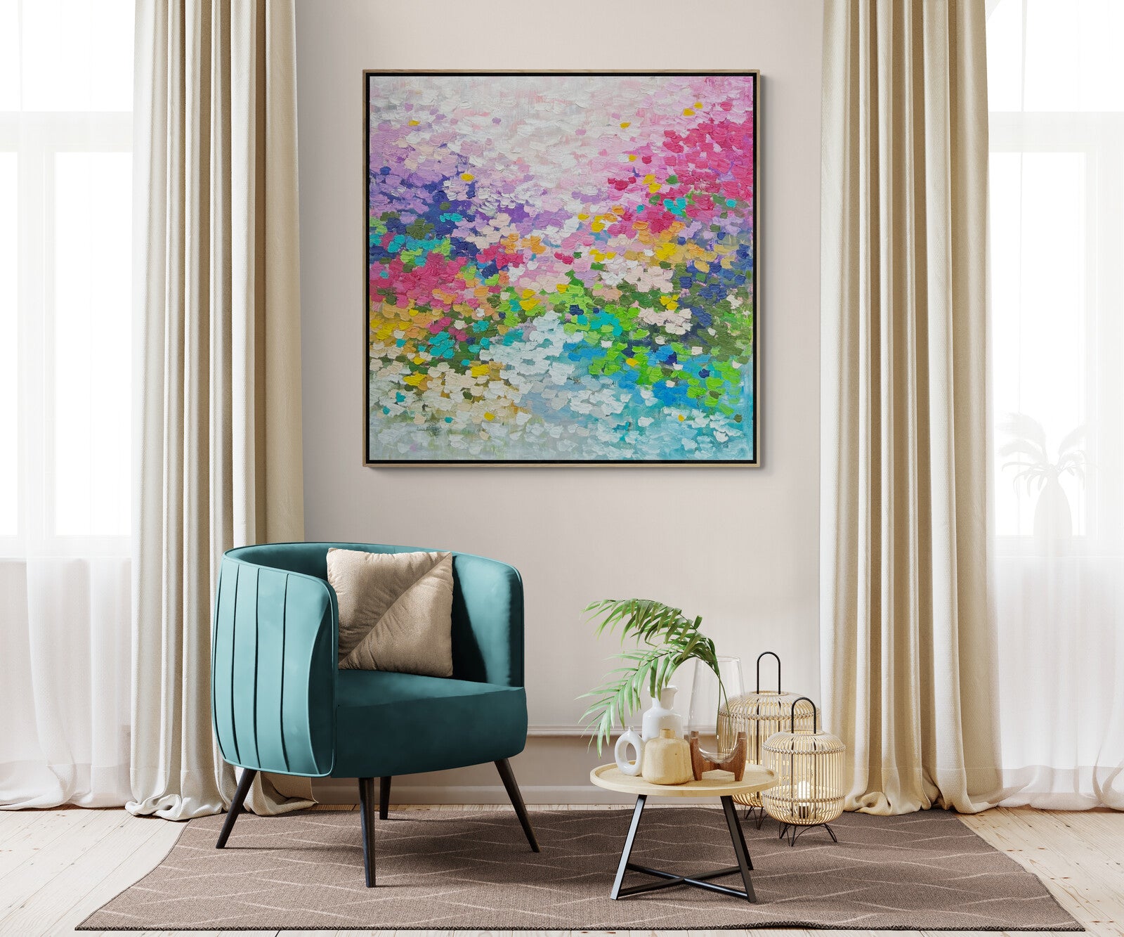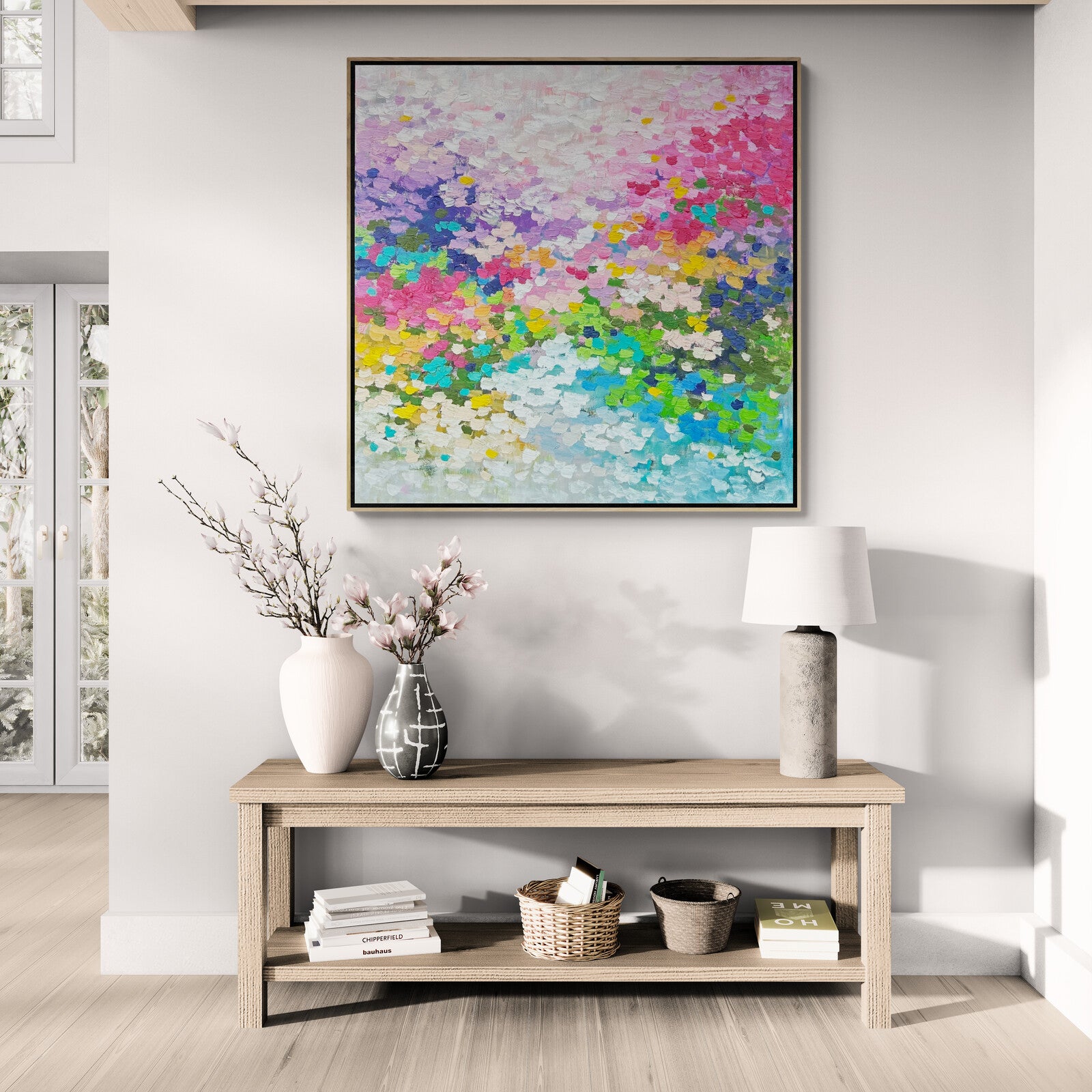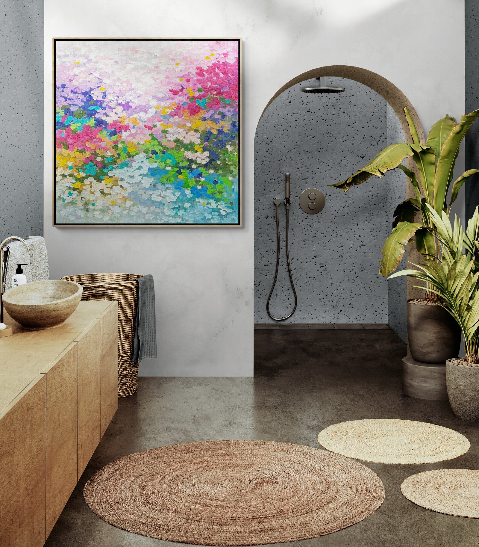 Embracing is a vibrant abstract oil painting by Belinda Nadwie that celebrates unity, love, and acceptance. Soft pinks, purples, greens, and blues blend together in textured, expressive strokes, symbolising harmony and emotional connection. The artwork radiates warmth and optimism, inviting calm and joy into any space.