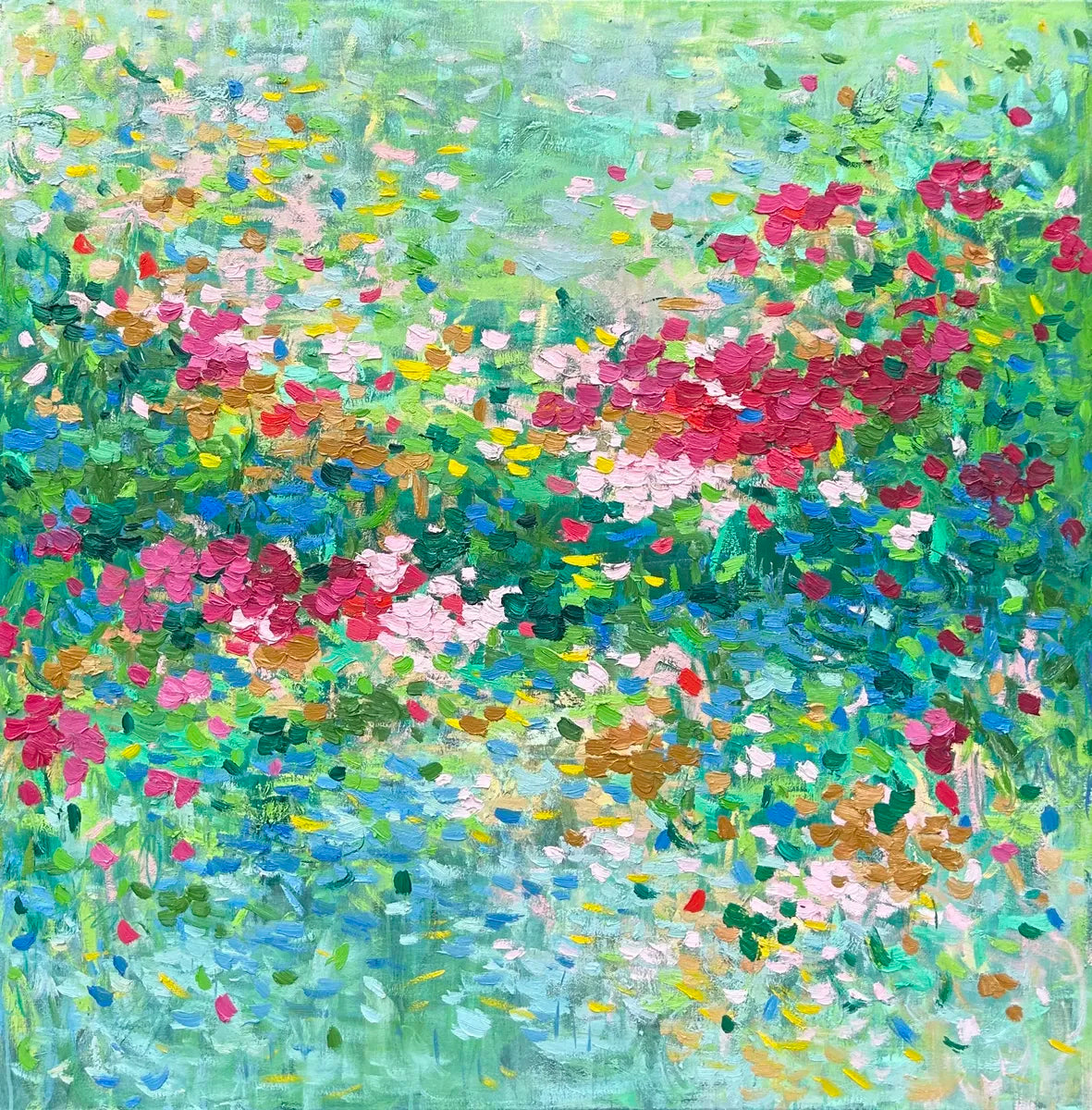 "Everything Magic" is an abstract painting that radiates energy through lush green textures layered with depth and movement. Vibrant pops of red punctuate the canvas, creating striking contrasts that evoke both mystery and vitality. The interplay of colors suggests a dynamic balance between calm and intensity, capturing a sense of enchantment in motion.
