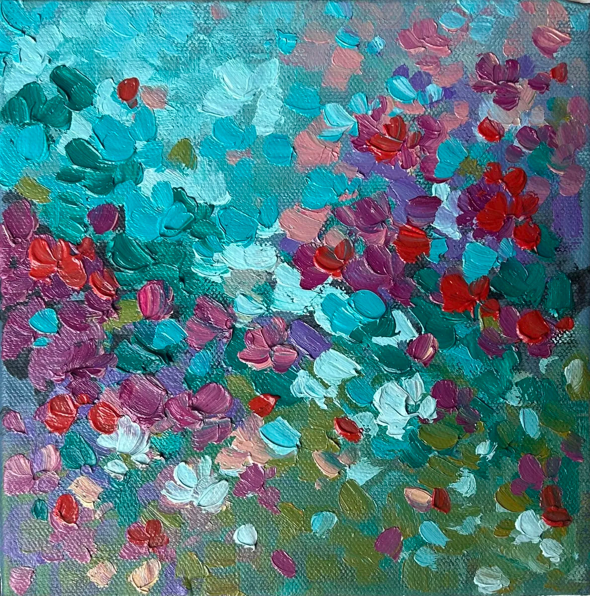 "Feels Like Home" washes the canvas in fluid blue and green tones, evoking the gentle rhythm of memory and belonging. Swirling forms and softened edges suggest landscapes not seen but felt—like the comfort of a place remembered in dreams.