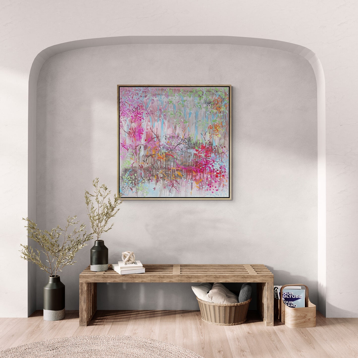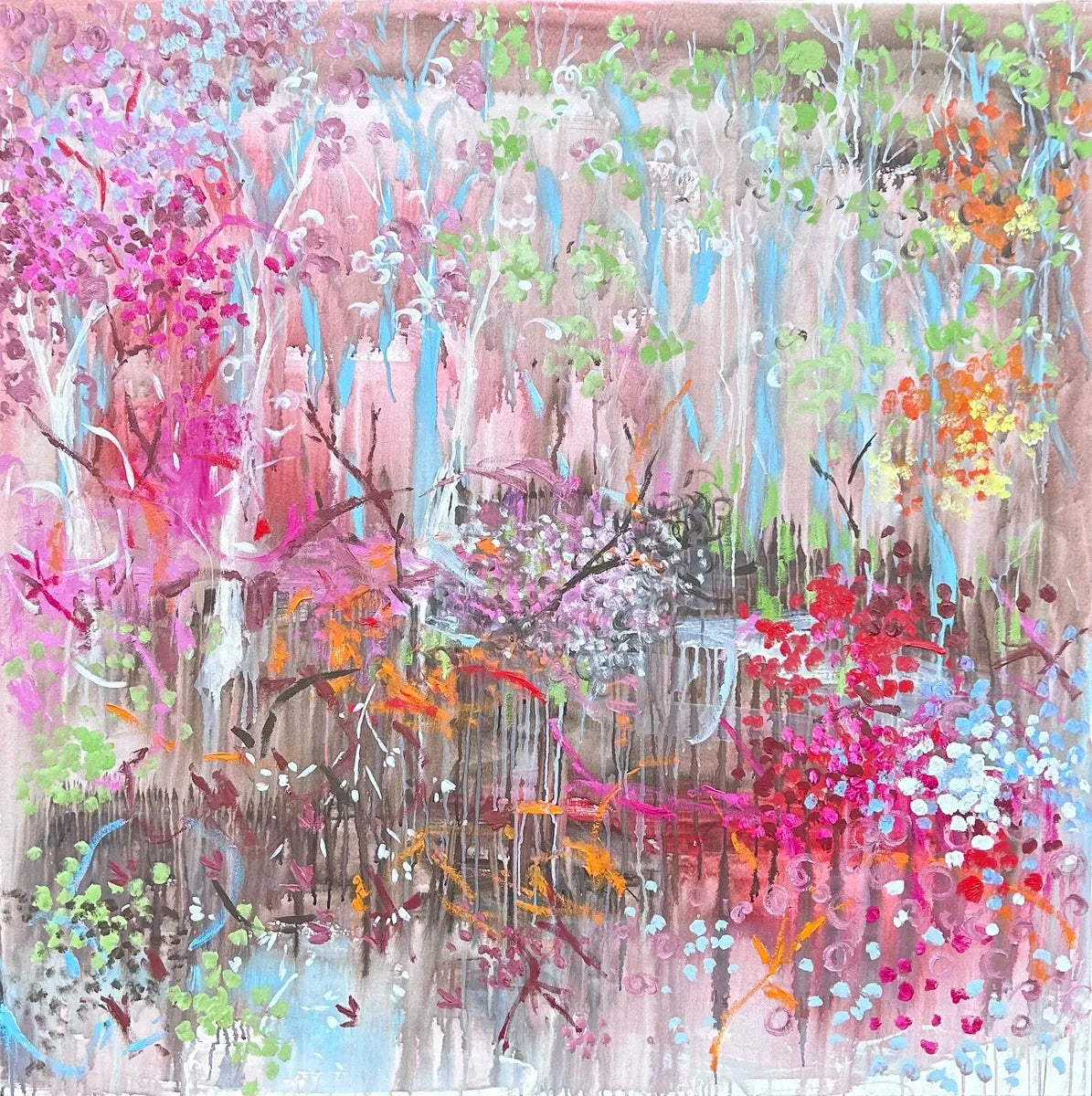 Footprints and Foliage evokes a tranquil passage through untamed nature, where delicate blush pinks and muted greens drift across the canvas like a fading memory. Interwoven with these gentle hues are bold strokes of dark branches—dense and shadowed—that anchor the piece with depth. It’s a quiet interplay between ephemeral softness and the weight of what lies beneath.