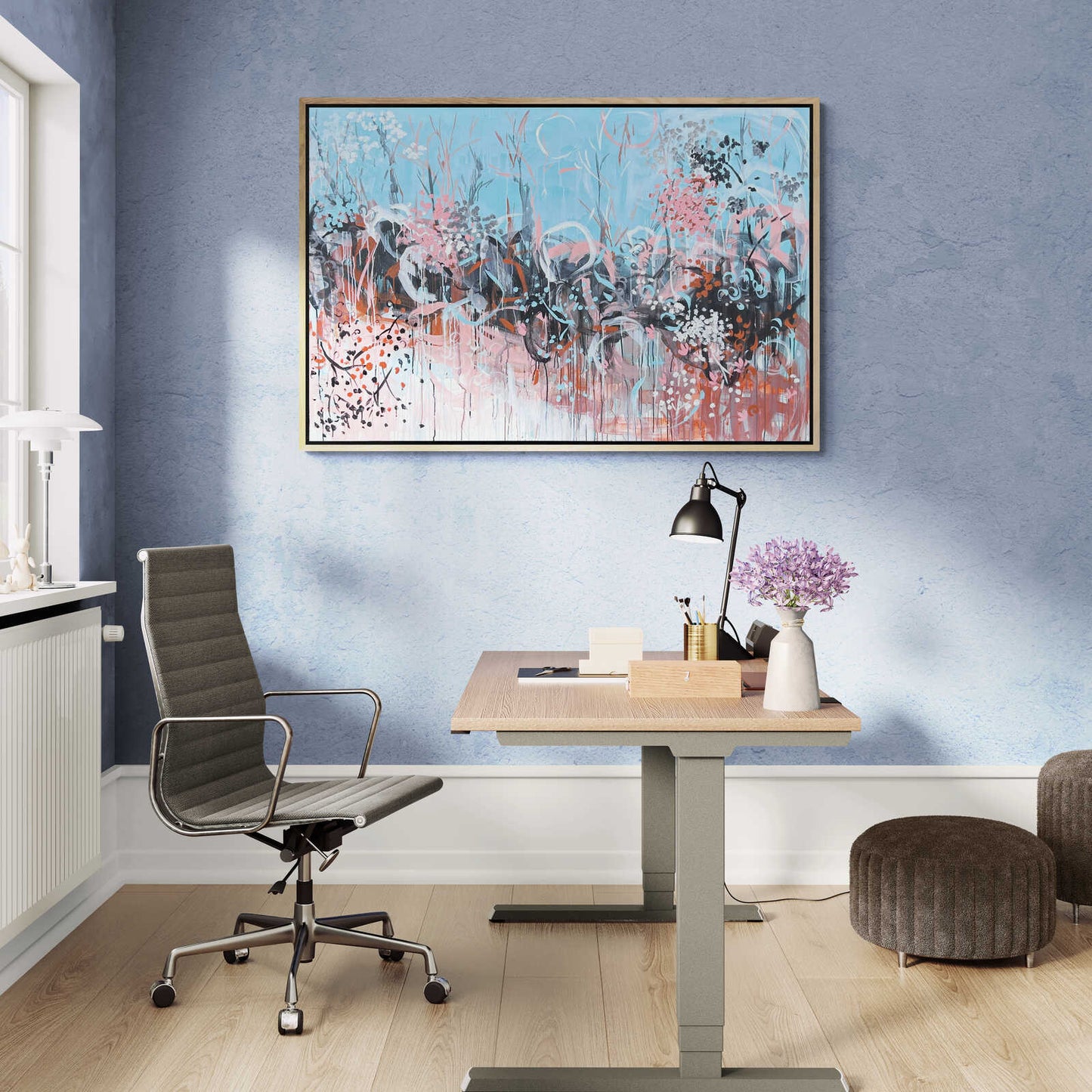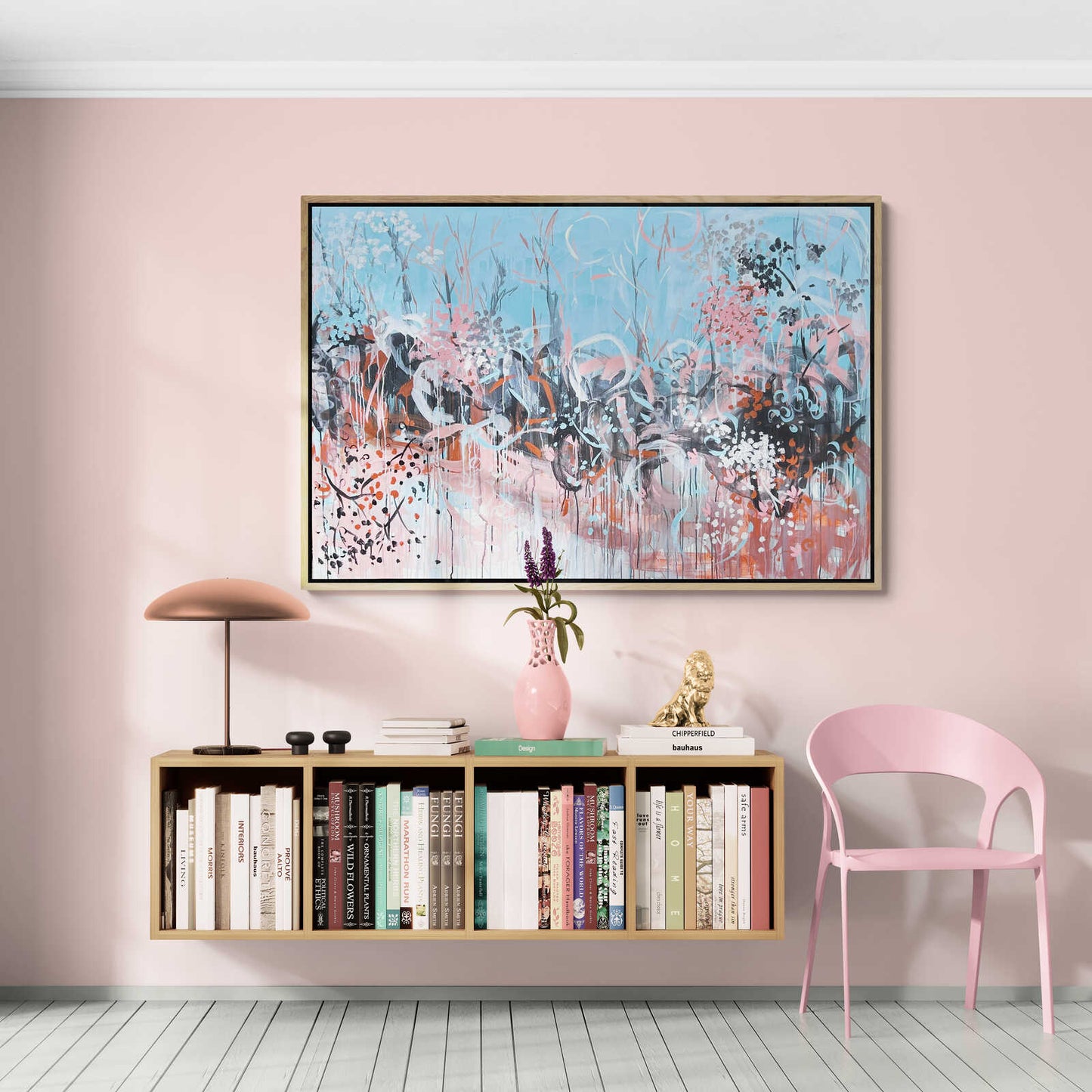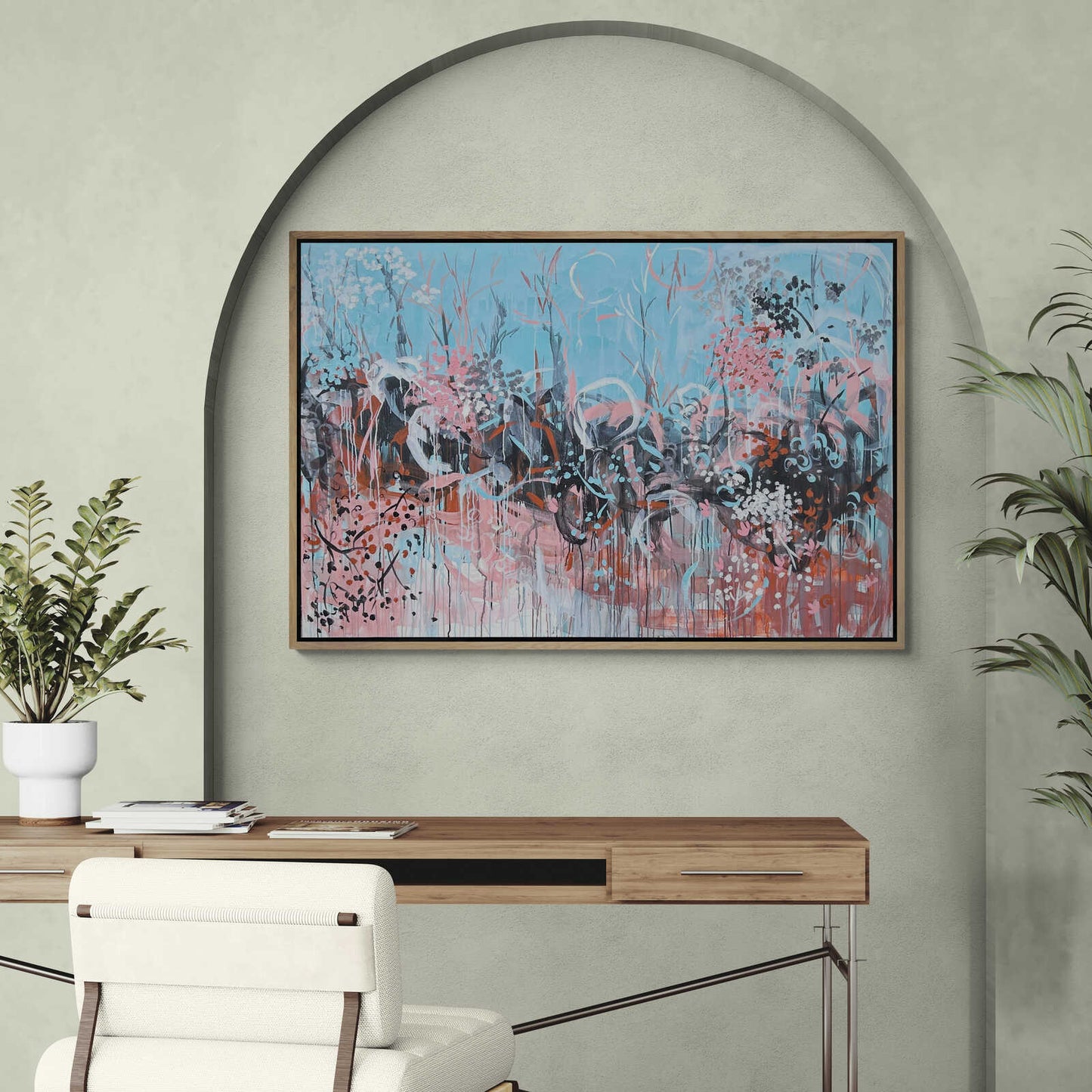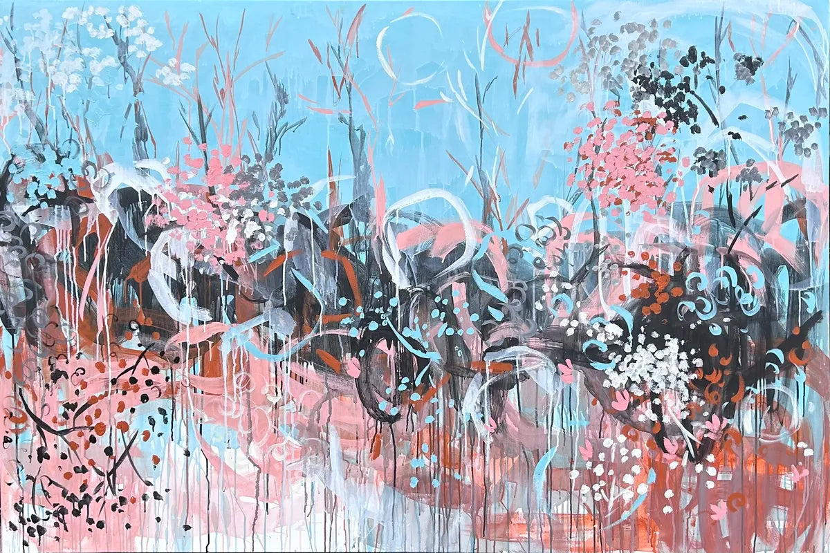 Going off Track lures the eye into motion—pink and white swirls cascade with playful unpredictability, brushing against the vast stillness of a blue backdrop. Beneath it all, a pinky earthy base pulses with warmth, anchoring the whimsy with quiet resolve. It’s a poetic detour, where paths dissolve into sensation.