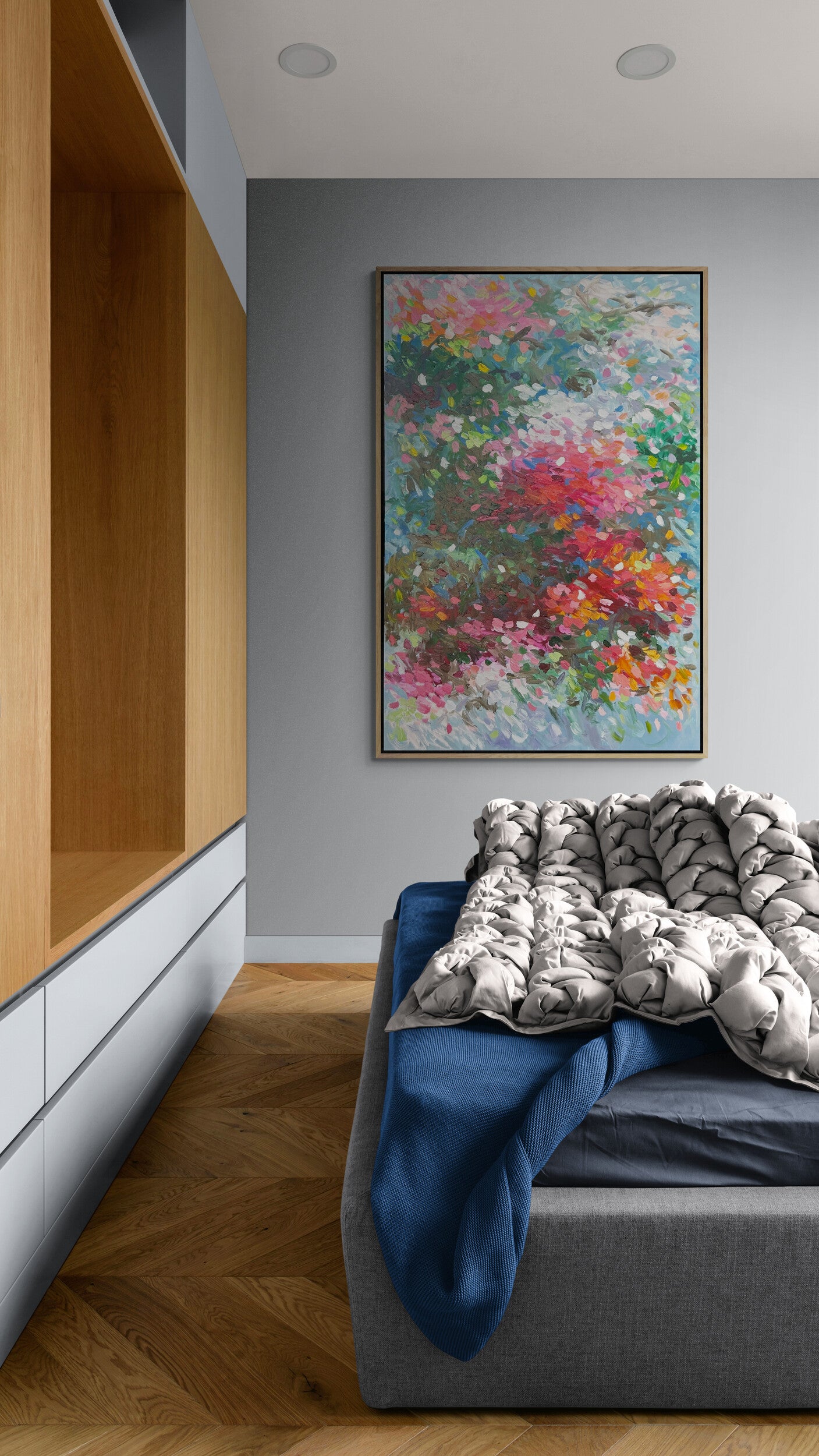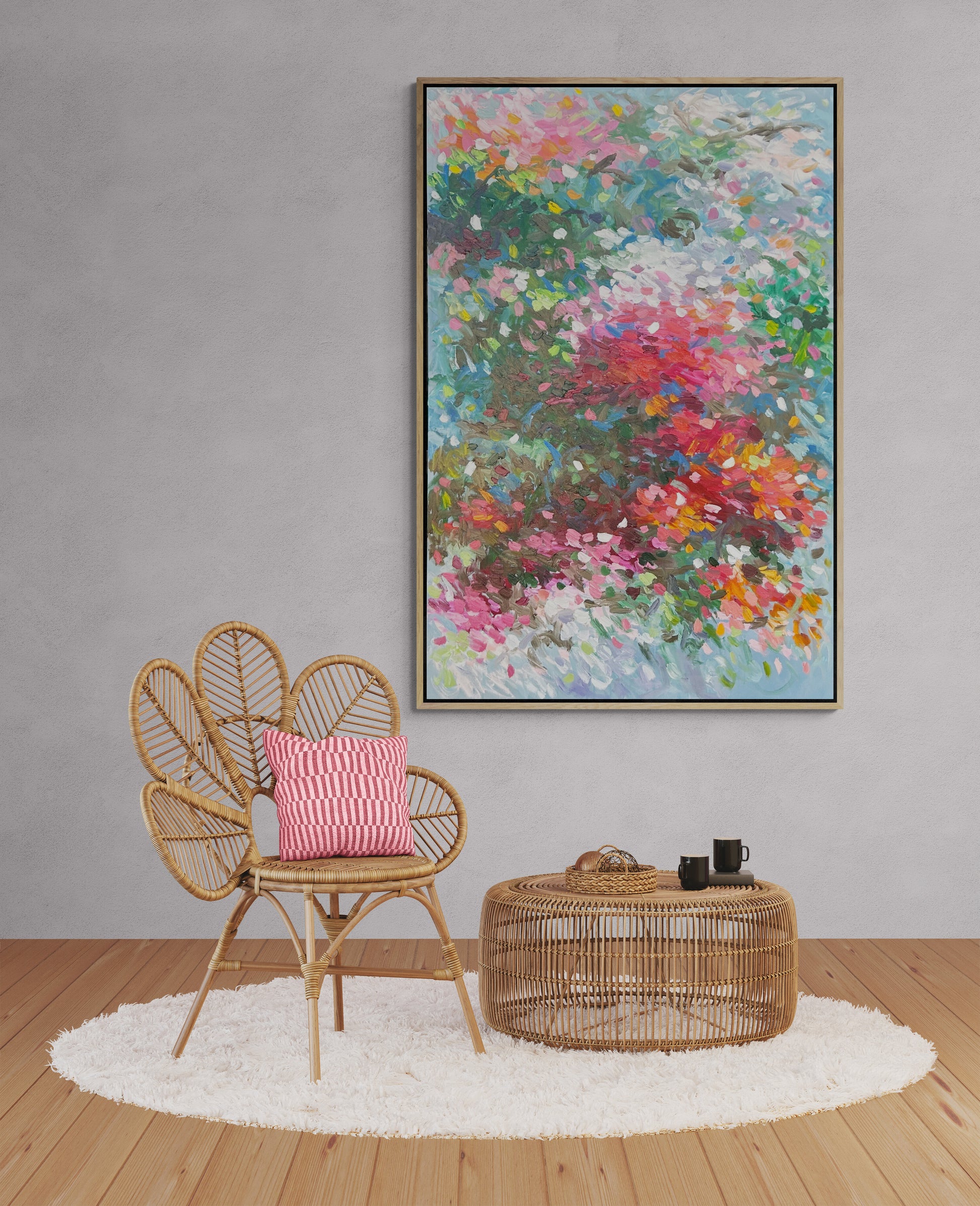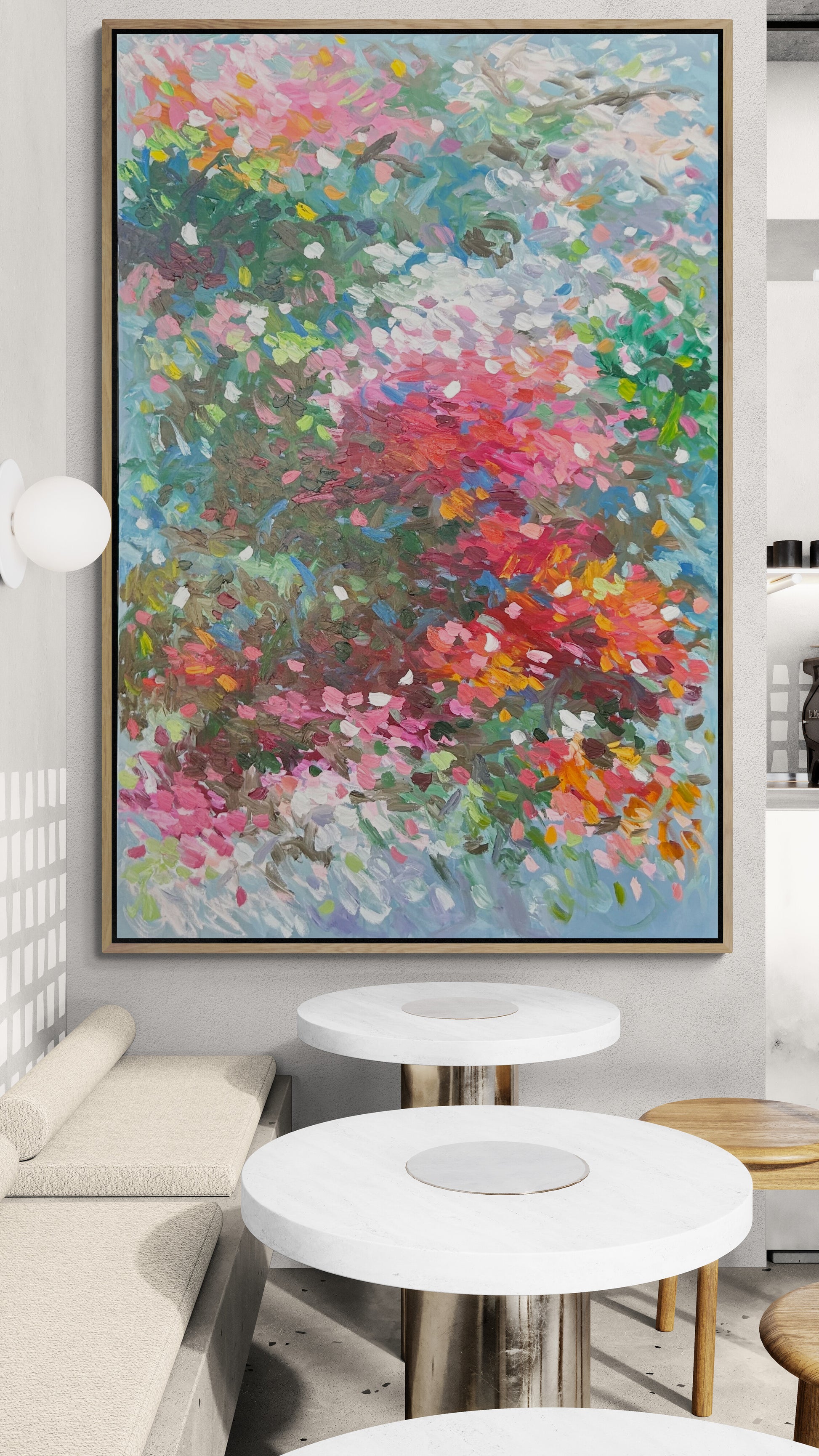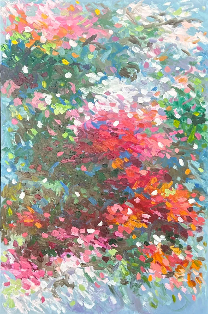 ' The Journey By Your Side' unfolds in tender greens and blush pinks, woven together with a subtle mix of shifting hues that feel like shared footsteps through a quiet landscape. The colors drift and mingle with ease, creating a sense of companionship that’s both calm and quietly uplifting. It’s an abstract reflection of moving forward together, carried by harmony and gentle emotion.