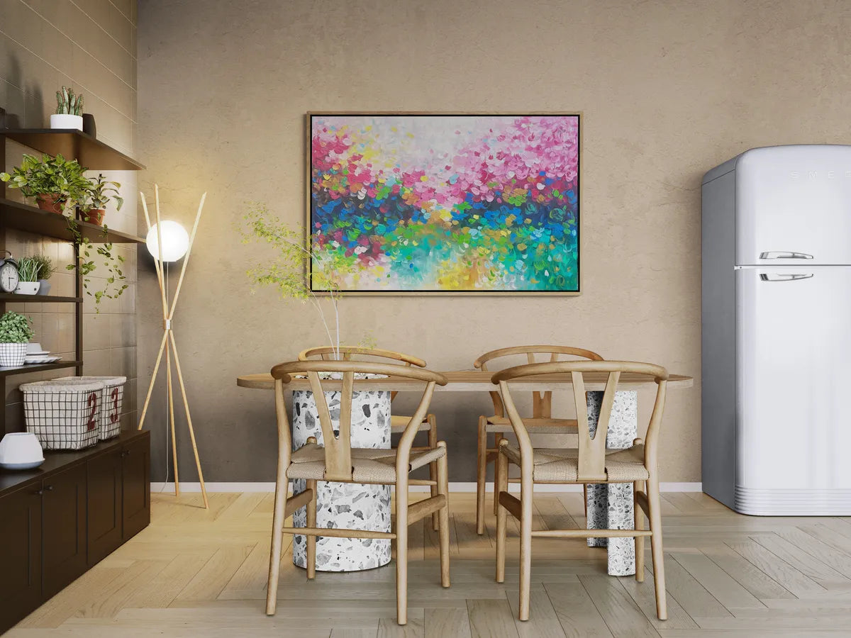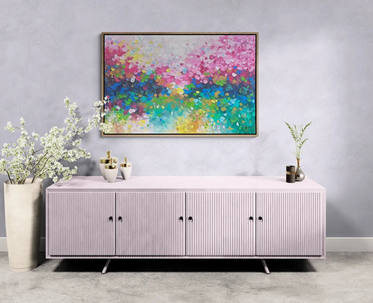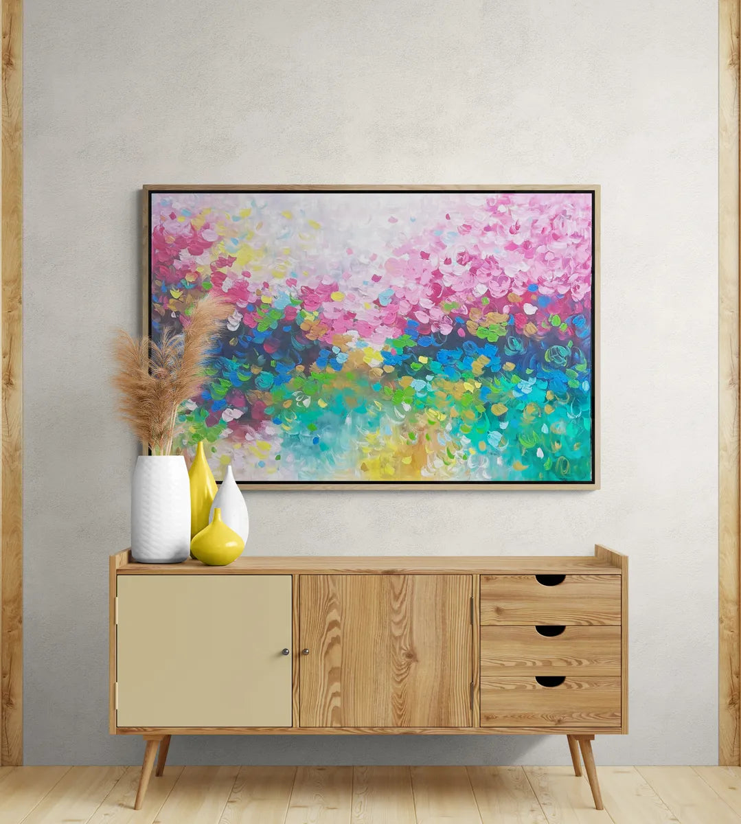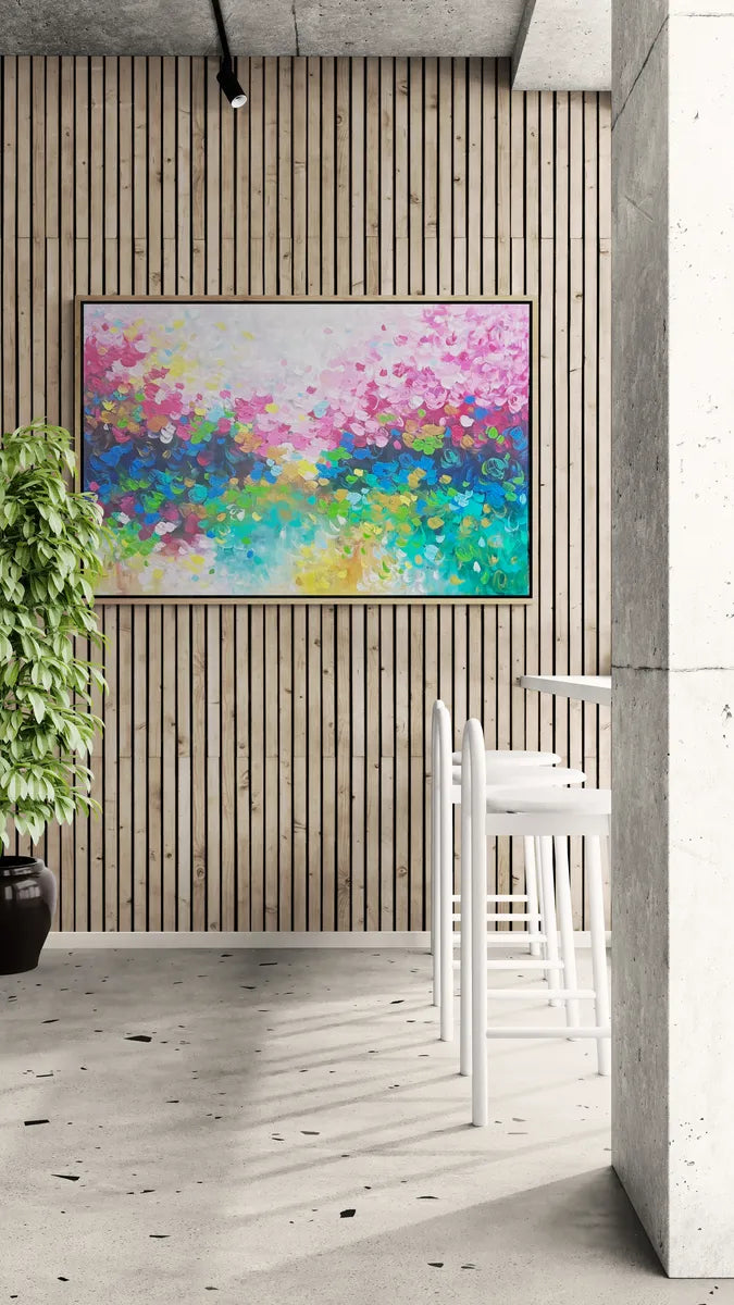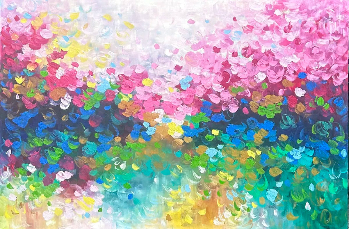 "Embraced By Your Love" is a dreamlike abstraction where soft pinks and deep blues swirl and blend, evoking the gentle intensity of emotional connection. Layers of translucent color ripple like waves, suggesting warmth, intimacy, and the quiet power of being held by something greater than oneself.