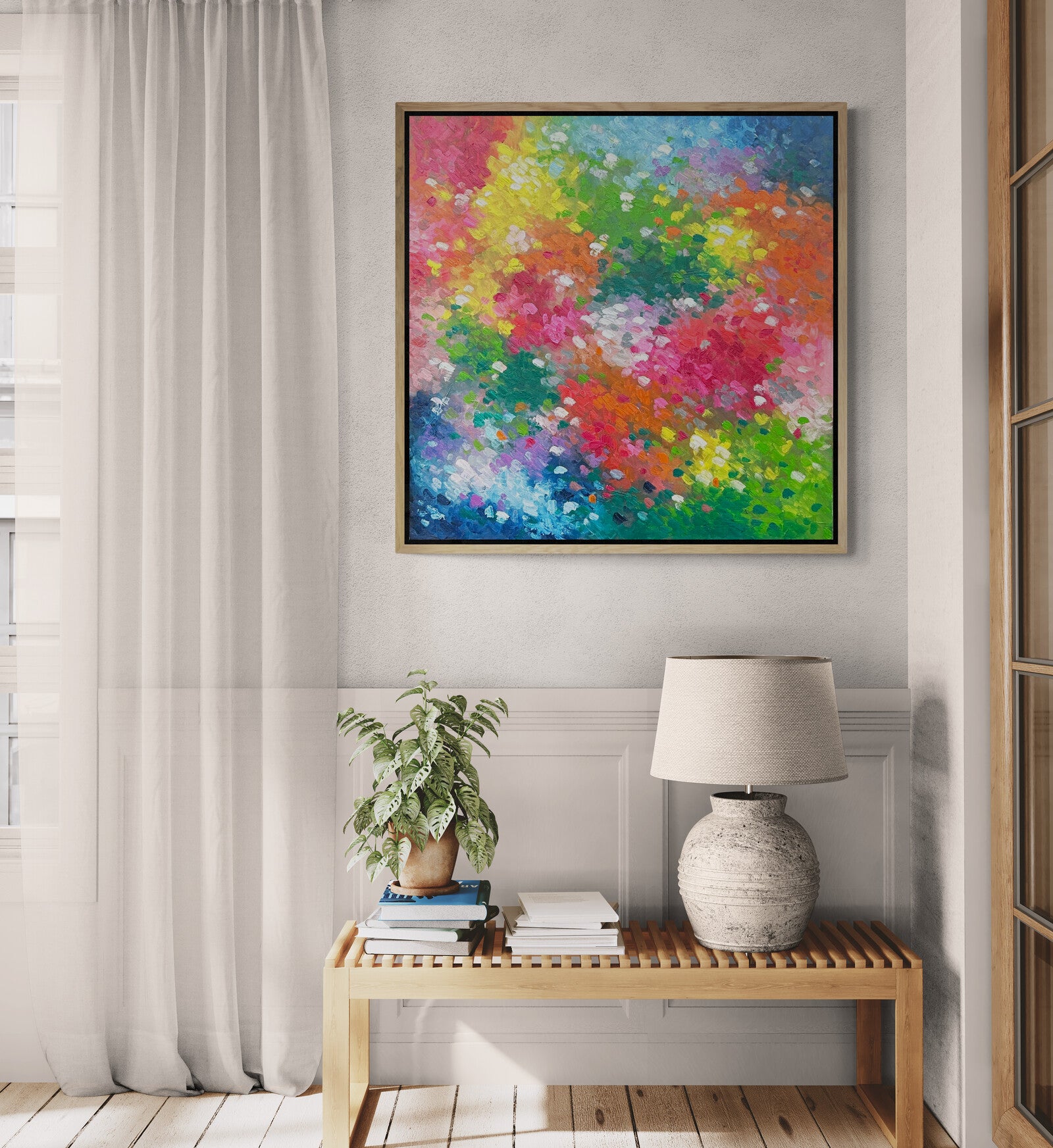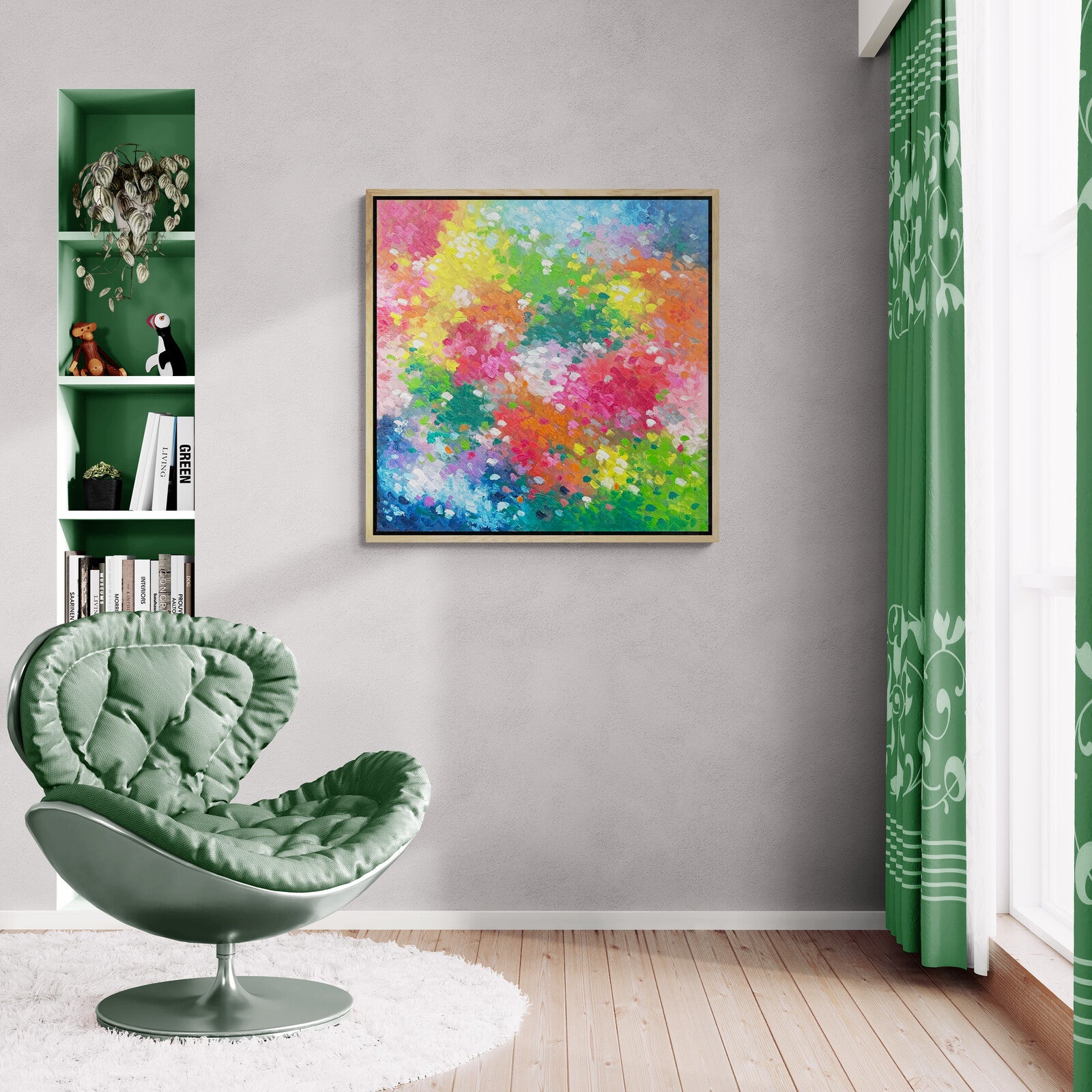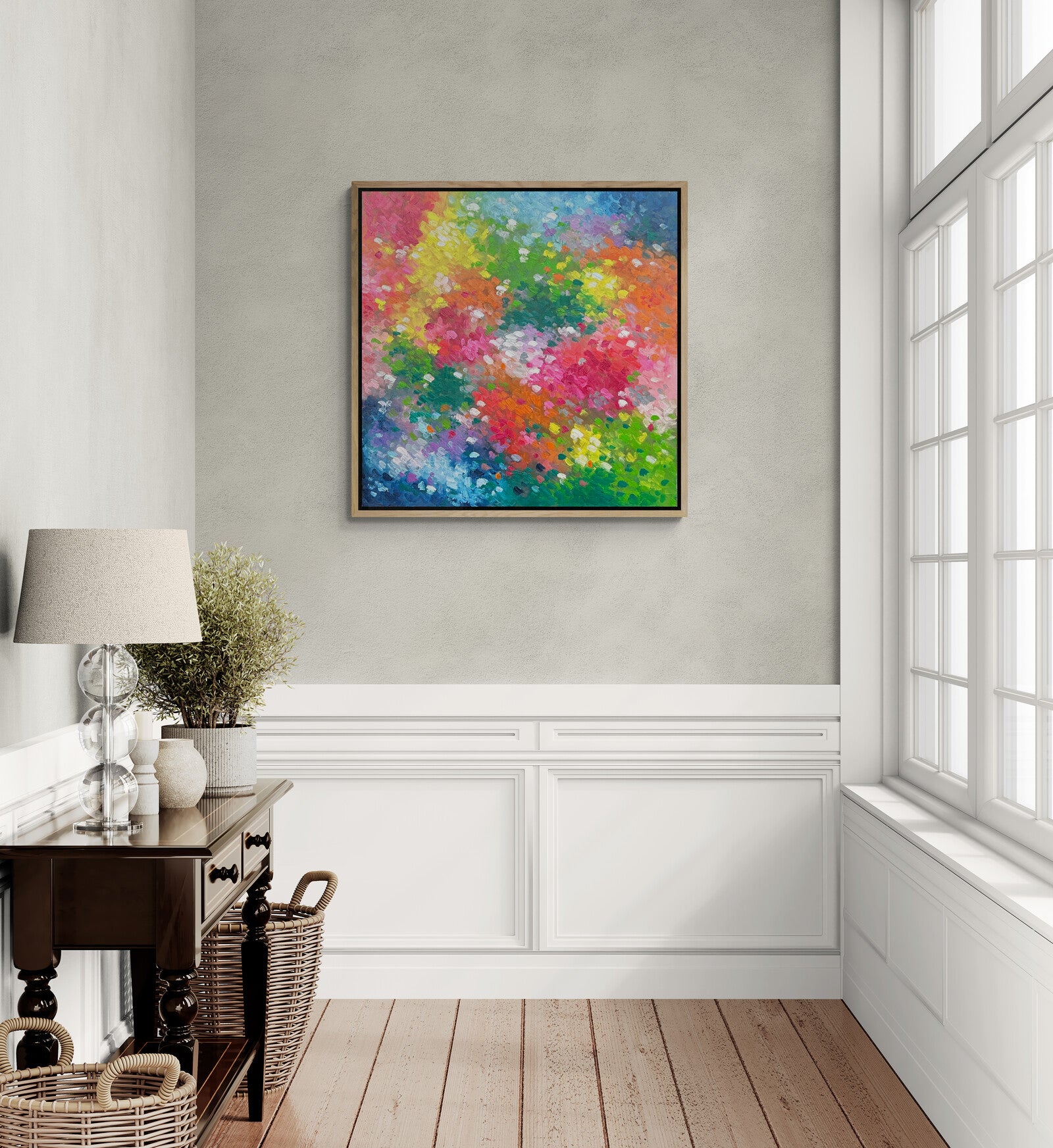 "Sunshine of My Life" bursts with vibrant pops of color, radiating warmth and joy through sweeping abstract forms. Bold yellows, fiery oranges, and electric pinks dance across the canvas, capturing the emotional brilliance of love and light. The composition feels spontaneous yet deeply intentional, like a celebration caught in motion.