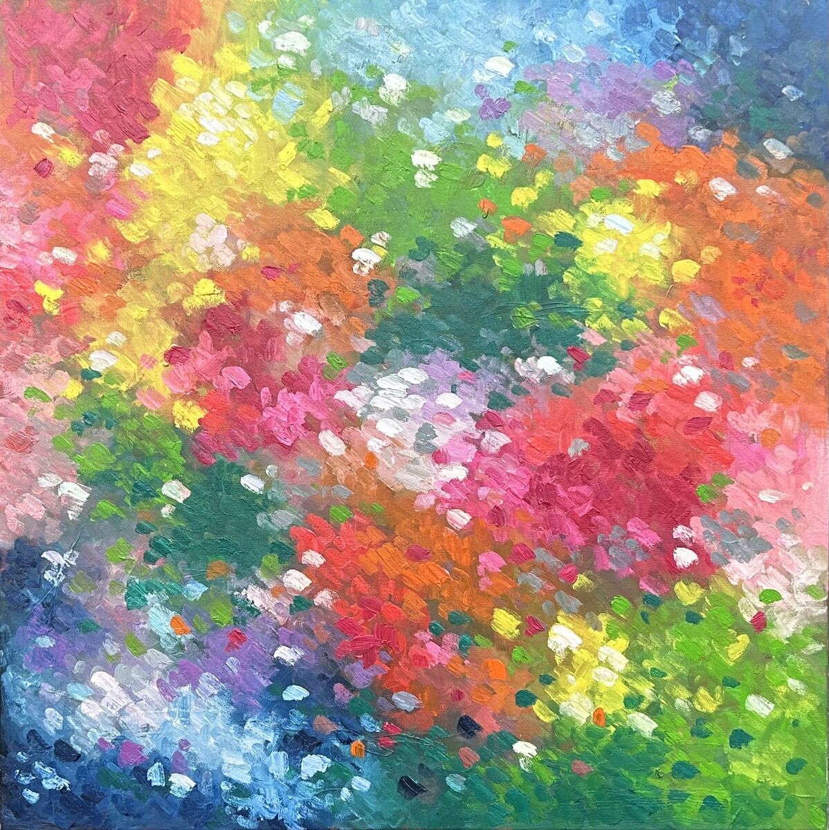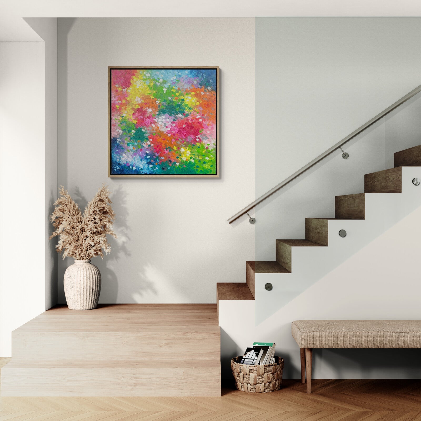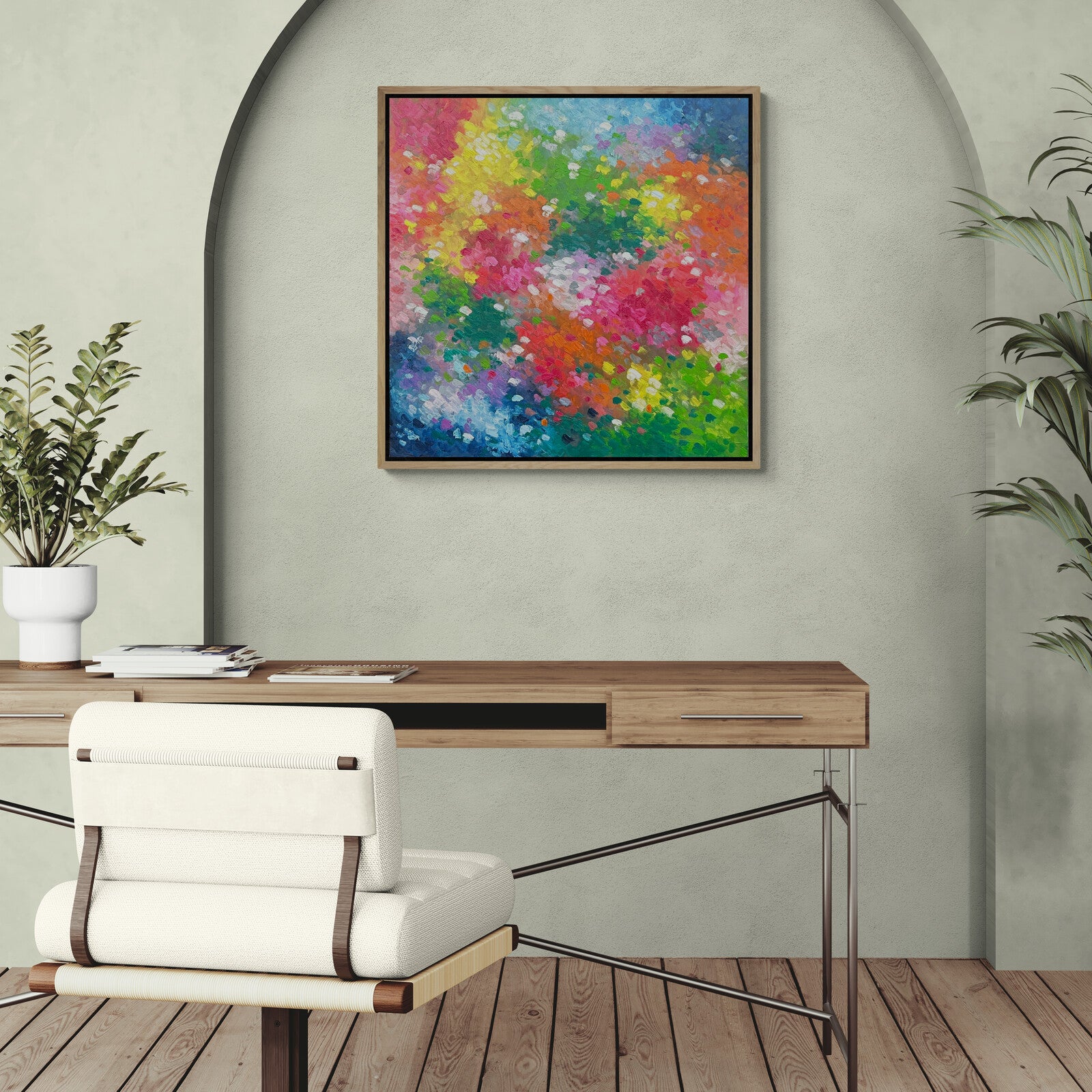 "Sunshine of My Life" bursts with vibrant pops of color, radiating warmth and joy through sweeping abstract forms. Bold yellows, fiery oranges, and electric pinks dance across the canvas, capturing the emotional brilliance of love and light. The composition feels spontaneous yet deeply intentional, like a celebration caught in motion.