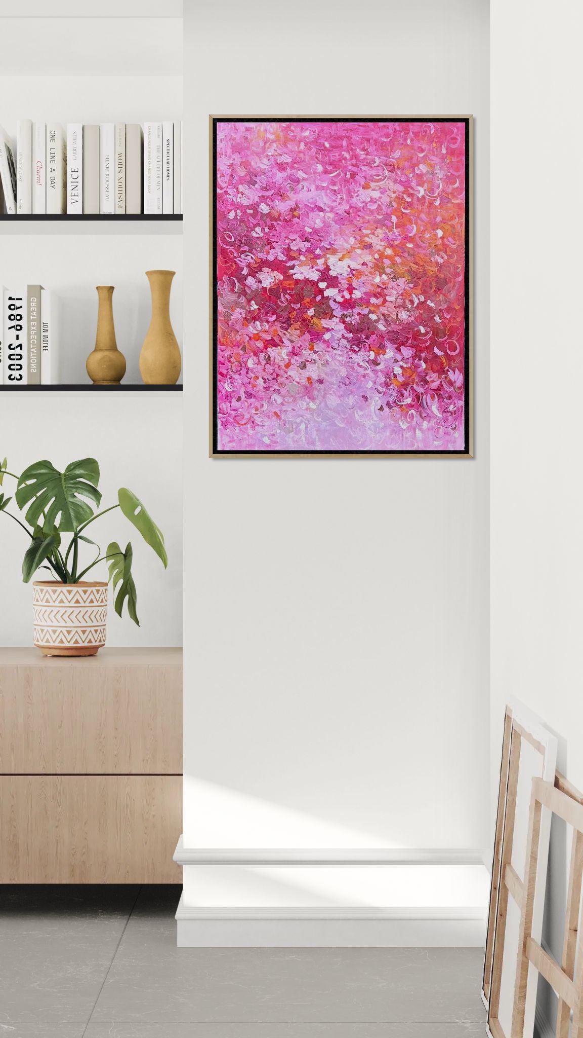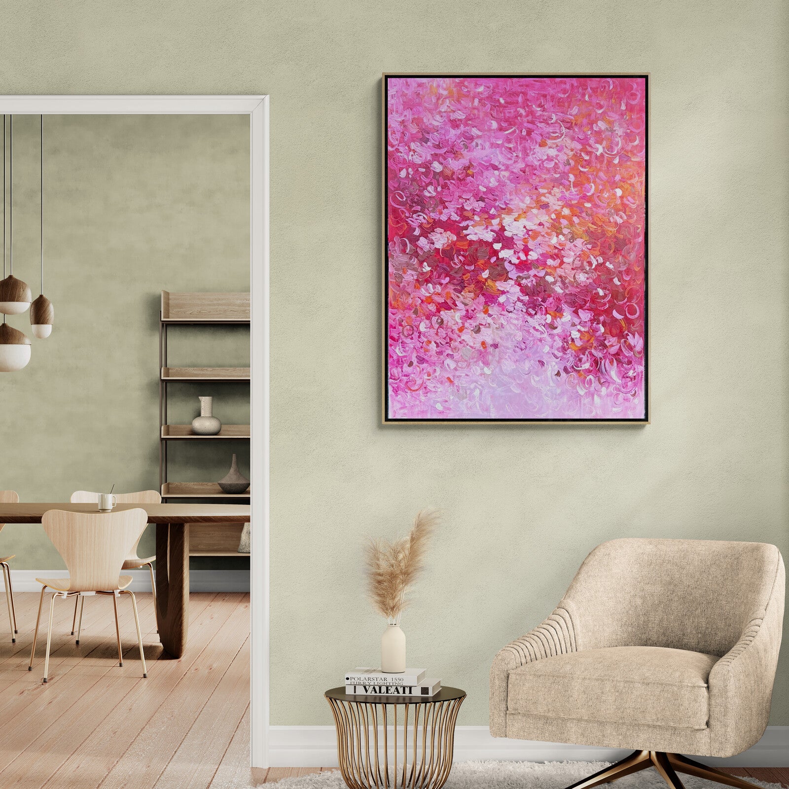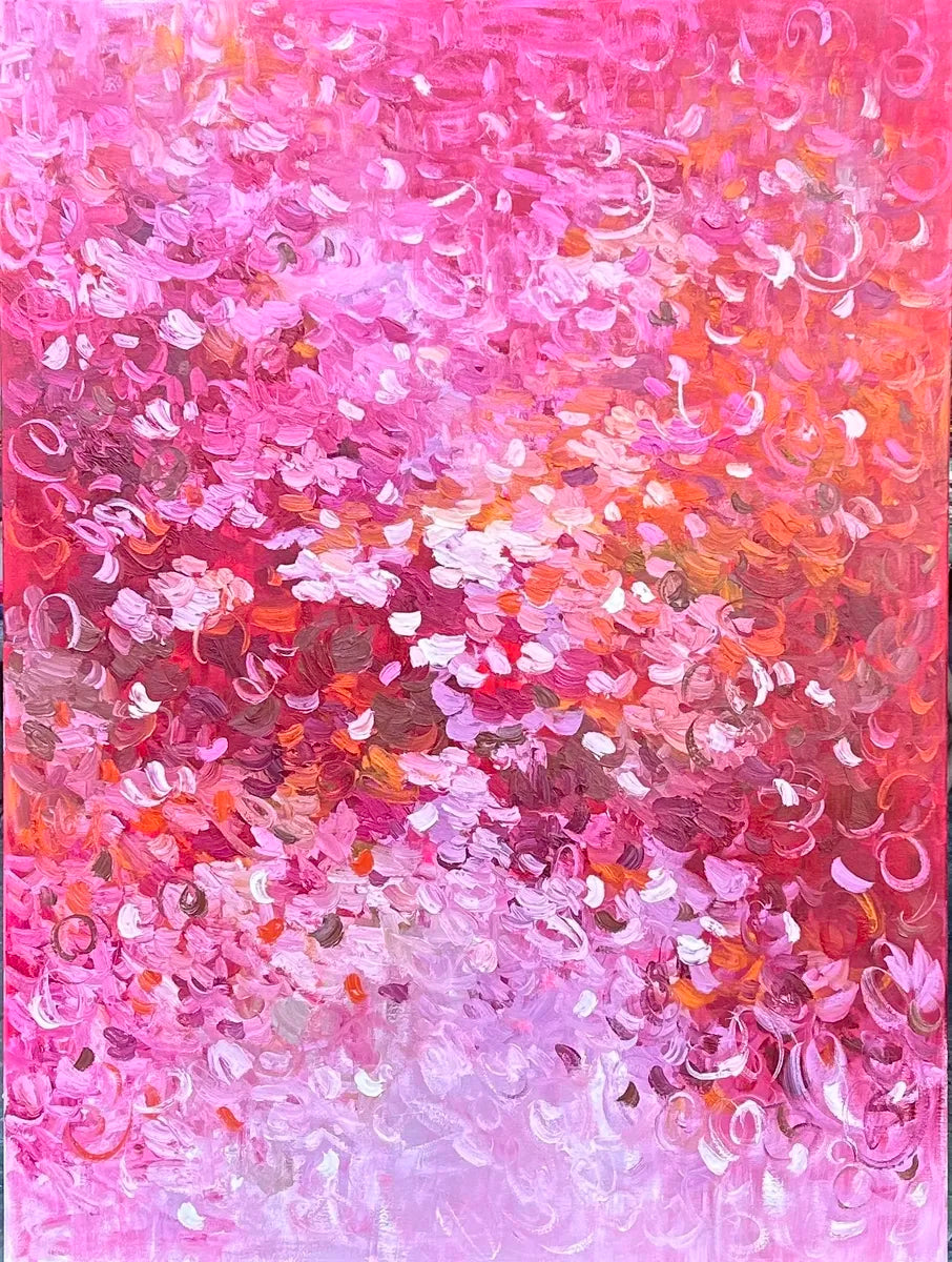 Belinda Nadwie’s abstract artwork "Understanding Love" radiates warmth and emotional depth through soft, pastel tones of purple, pink, and red. Her expressive brushwork and layered textures evoke a sense of tenderness and fleeting beauty, reminiscent of petals drifting in the wind or light filtering through foliage.