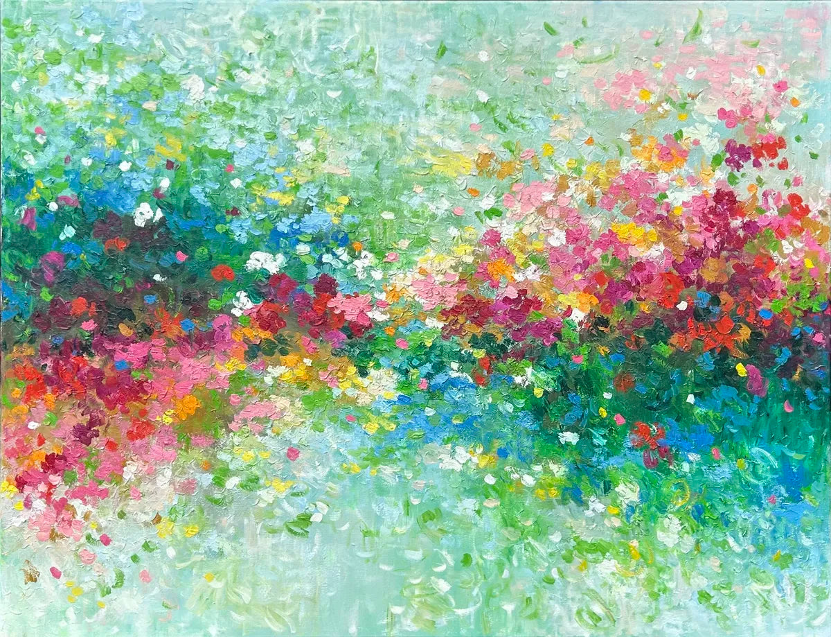 “Whispers of Light” unfolds as a drifting interplay of reds, blues and greens that seem to breathe across the canvas. Soft transitions blur the boundaries between each hue, creating a sense of quiet motion, as if color itself is murmuring in the air. The overall effect feels like a gentle pulse of energy, subtle yet deeply atmospheric.